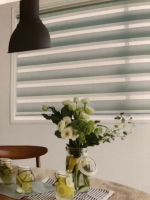 調光ロールスクリーン・・・ボーダー柄のスクリーンが前後で重なり合うことで、光を自在に調光できるロールスクリーンです。