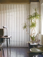 バーチカルブラインド・・・窓からの光をコントロールして、心地よい空間に。広々とした窓におすすめです。
