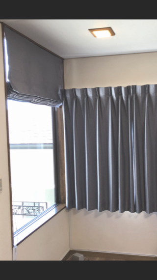 濃いグレーの花柄のカーテンと同系色のロールスクリーンとの
