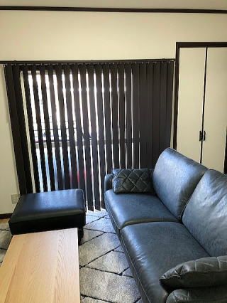 黒をアクセントにした落ち着きのあるリビングルームにグレー色のバーチカルブラインドを