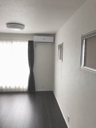 枠内に付けることでエアコンとの干渉も解消されてスッキリとした落ち着きのあるお部屋に