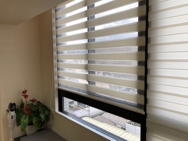 シースルーのロールスクリーンと木製ブラインドとの組合わせです。